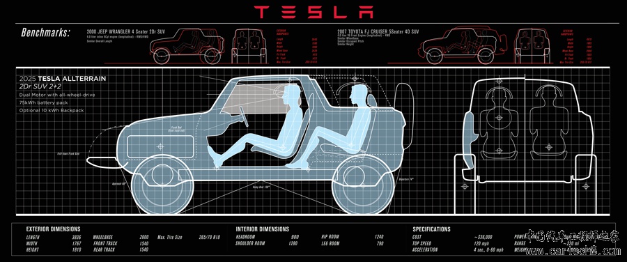 前段时间,特斯拉公布了自己的“下个十年计划”,其中就包括一款电动皮卡车型,据马斯克的形容:它是一种“新型的皮卡”。 本来电动皮卡这个概念就挺拗口,因为纯电动皮卡市场上根据就没有,绝大部分人都很陌生,现在马斯克再形容它为新型皮卡,这就更吊人胃口。 然后近日,金刚从外媒获悉了这一新型皮卡的设计草图与样车,为了更好的视觉效果,就不处理了,原图奉上(转载请注明哦,写文章不容易!): 草图: 样车: 不知道各位看完有什么感受,反正金刚看了之后,就发现一个秘密:这车是“山寨”自主品牌的…其实,早在去年上海车展,北汽就发布了EX概念电动车,如下图,当时北汽也宣称它为电动皮卡,是为年轻一代消费者量身订做,预计今明两年内上市。由于外型很有“特点”(丑),而且北汽素有“自主模具厂”称呼,加上是一款皮卡,所以大部分媒体都不看好这款车。 还是回归特斯拉这款车,作为国际大牌、硅谷精英、新能源汽车旗帜,特斯拉怎么可能做山寨北汽这种事呢?所以还是看看这款车有什么亮点之处。 整车线条与特斯拉其它车型一样,以曲线为主,多重曲面使得前脸比较流畅,通过不同材料、颜色的搭配,整车极赋后现代设计感,让人觉得非常有科技感,这也是继承了其它车型的设计特点,不过这款车的车身用了多重颜色搭配,要知道,其它特斯拉车身都是单色设计。同样,前舱还是特斯拉式设计,用于储物,不过这款皮卡的前储物舱底下已经有备胎了,所以上部的空间应该不会那么富裕,为了达到整车轻量化,C柱与车门都是可以拆卸的,车顶有个放置其它物件的托架。 由于只是设计草图与样车,动力方面的详细数据并未透露,但是可以确定的是大致布置。该车为一台后置电机后驱车,电池组位于底盘下面,为了再此基础上增加续航里程,后备箱门可以挂两个额外电池箱。 除此以外,从设计图可以看出,这款车有两个版本,两座跟四座。两座的话,就是一台皮卡,四座为一款越野车。另外,根据马斯克透露的下个十年计划,特斯拉的紧凑型SUV将基于MODEL 3平台,但是这款皮卡是否是基于这个平台并不清楚,还有,据相关媒体报道,特斯拉拆卸了一台吉普牧马人,所以,这款皮卡的平台到底是MODEL 3还是牧马人,还要继续关注。为了更好的越野能力,可以看出这款车的悬架行程很长,底盘很高,前后离去角相当得大。由于主要电池组集中在底盘上,所以整车重心也不会很高,这对越野帮助能力帮助不小。 最后金刚还是总结下,论外型,这款车很“潮”,应该可以吸引不少有钱的年轻人,而底盘的通过性也是非常不错,对于这款车的续航能力我们也不用担心,毕竟特斯拉出品,所以,总得来说,这款车的日常实用性还是比较高的,在以皮卡为国民车的美国市场,看起来这款车的前景还非常不错的。 |