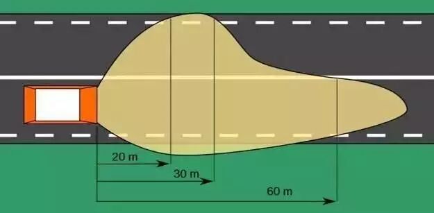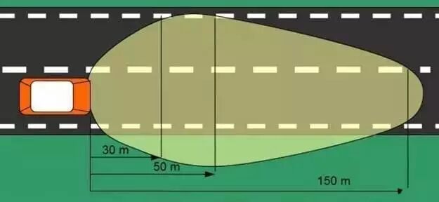 右边比左边照得远 如图所示,橙色小车从左向右行驶,而它的近光灯在道路上投射出的光斑大致就是这个样子,而这种近光灯形式就是俗称的“欧规光型”,事实上,这是法律规定的! 欧规灯光与美规灯光 世界上有关汽车灯光的法规有很多种,ECE和SAE是两个大方向。ECE也就是俗称的“欧规”,通行于世界上包括欧洲在内的大部分国家,按ECE法规进行设计,近光灯照明范围大致就是上图里面这种。SAE法规主要在北美使用,与我国无关,就不多说了。 联合国欧洲经济委员会汽车法规(简称E.C.E),E标志源于欧洲经济委员会(EconomicCommissionofEurope,简称ECE)颁布的法规(Regulation)。目前ECE包括欧洲28个国家,除欧盟成员国外,还包括东欧、南欧等非欧盟国家。ECE法规是推荐各成员适用,不是强制性标准。成员国可以套用ECE法规,也可以延用本国法规。 50年代,欧洲就出现了统一的ECE法规,随着全球化的发展,越来越多的国家认识到制定全球统一技术法规的重要性,从80年代由美、欧、日三方共同提出,到90年代在国际论坛上正式提出要制定全球统一的技术法规,将欧洲1958年的协定书修改成为全球通用的法规。 2000年10月10日,中国签署采用全球机动车技术法规UN/ECE协定书。成为该协定书的第9个签字方。2000年12月9日,签字正式生效,标志着中国正式成为关于制定全球机动车技术法规协定书的签字国。 欧规为何这样规定? 原因就是开篇提到的两个字:安全。前灯如何设计才能做到“自己看清路,同时不影响别人看清路”一直是此前车辆厂商所头疼的问题。 首先解释前半句:自己看清路。中近距离(图中的30m以下),灯光范围够宽,能看清整个路面,包括两侧的非机动车和行人。远距离(图中的60m),能照到帮助提早发现前方的状况。 再来解释后半句:不影响别人看清路。为了尽可能不影响对向车道驾驶员的视线,就需要尽可能减少光线照到他们。所以上图灯光左侧在30m以上的部分突然“收窄”,正是要做到这一点。 远光灯又是怎样的呢? 近光灯的设计原则是“自己看清路,同时不影响别人看清路”。相对应的,远光灯的设计原则则简单粗暴:我要看得远!远光灯的光型如下图: