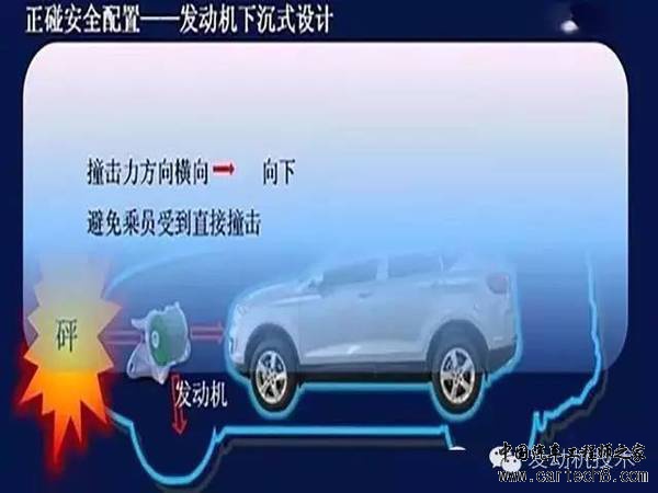 沉式发动机设计 汽车在受到前方撞击时,前置式发动机很容易被迫向后移动,也就是挤向驾驶室,使车中生存空间变得更小,从而给驾乘人员造成伤害。为了防止发动机向驾驶室移动,汽车设计人员便为发动机安排一个向下沉的“陷阱”,一旦汽车受到前方撞击,发动机便会向下移动而不是直接撞向驾乘人员。