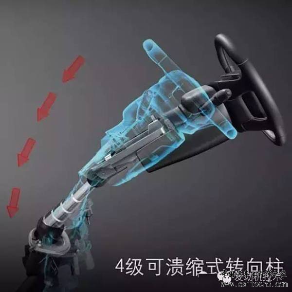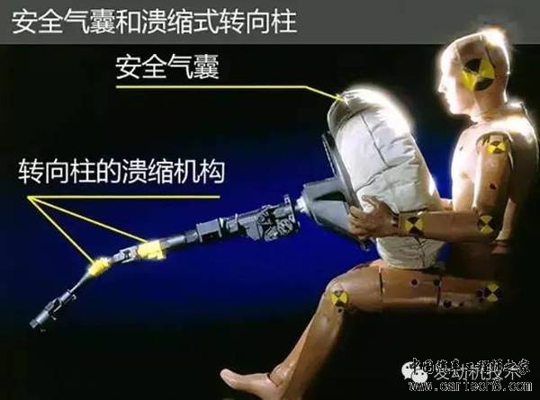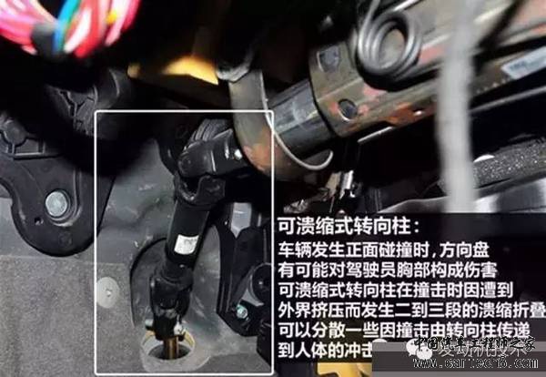 可溃缩式转向柱 方向盘和转向柱与驾驶人的距离相当近,当发生正面撞击时,它们常是造成驾驶人头部、胸部受伤的主要原因。用来控制汽车方向的方向盘和转向柱,事故中转瞬间就成为最致命的武器。