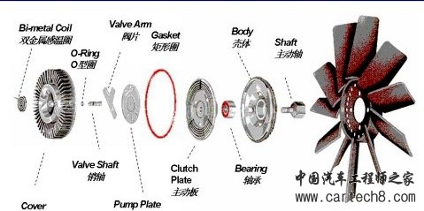 硅油离合器的原理可以简单理解成在发动机和风扇之间装一个非刚性连接的传动机构,当发动机温度比较低的时候,这个机构里面会有个空腔存在,发动机没法把动力传递到风扇上,此时发动机此时只是空转,风扇是静止不动的。而当发动机温度变高(一般高于65度),离合器上有一组双金属片因为热胀冷缩开始变形,带动一个阀门让硅油填充到这个空腔内,由于硅油是种很粘稠的高剪切力物质,便充当起了传递动力的媒介,发动机就带着风扇转起来了。而且温度越高,阀门开口越大,流进空腔的硅胶就越多,风扇的转速就越快。如果你的老爷车在冷车启动时风扇就拼命转或者发动机很烫了风扇还纹丝不动,那十有八九是硅胶离合器坏了。