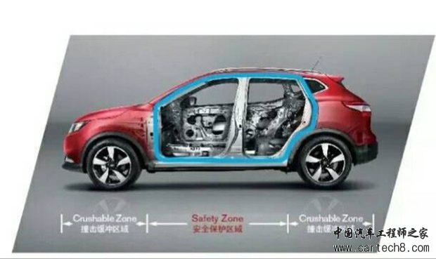 何为吸能设计?简单地说,把汽车的除乘客舱以外的部分作为溃缩吸能区间,在碰撞时作为缓冲空间减少驾驶室所受到的冲击,因此减少乘客受伤的机率。