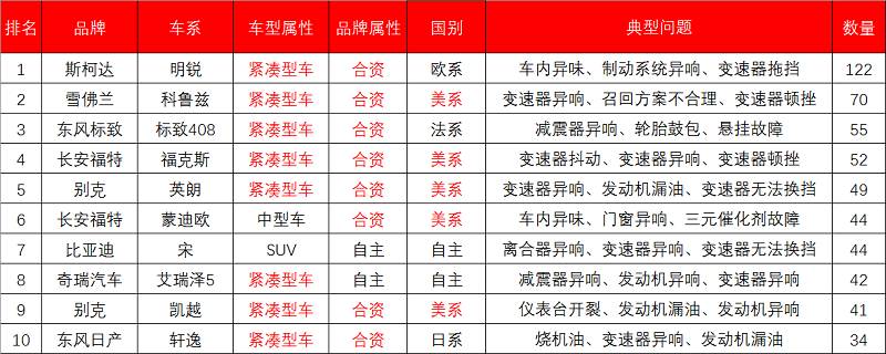 近几个月投诉榜单新面孔 作为高性价比的车型 其销量远远多于投诉量 显然这点投诉并不多 但既然能上榜 也就证明它有需要改进的地方 发动机漏油、烧机油、变速器异响 这都是比较严重的问题 总的来说 本月投诉量总体不多 也没像12月份那样出现吉利汽车 以“无法按时交车”为由进行投诉的奇葩情况 也有可能是过年的原因 导致整体投诉量比前几个月都有所减少 合资、美系、紧凑型车出现的问题较多