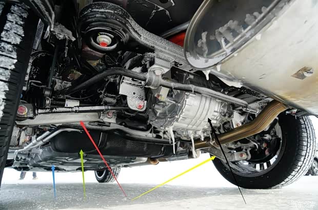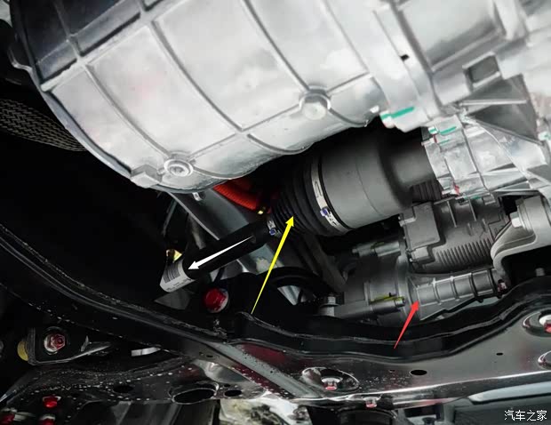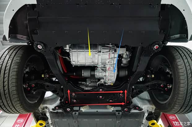 拆下护板后,可见宋EV300两驱版使用的加强“框”型前副车架,一级160千瓦驱动电机总成。 红色箭头:“框”型前副车架加强端,替代了秦EV和e5使用的副车架加强组件 黄色箭头:160千瓦永磁同步电机(与唐100后驱动电机同源) 蓝色箭头;减速器总成