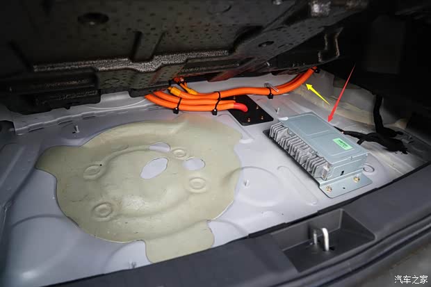 宋EV300两驱版后地板车身焊接平整,布置了外置功放(红色箭头)和慢充线缆(黄色箭头)。