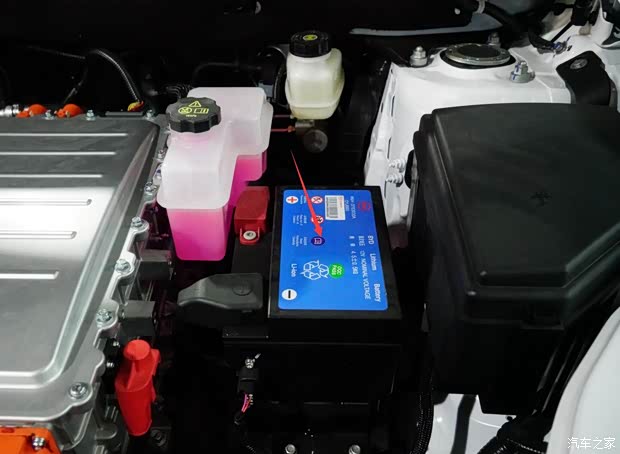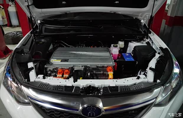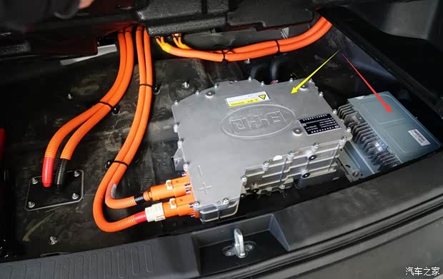拆除了防尘罩,裸露出比亚迪研发并制造的第2代“4合1”控制单元。与秦EV、e5一样,配置了两套散热系统、启动用锂电池和电动空调辅助加热系统。