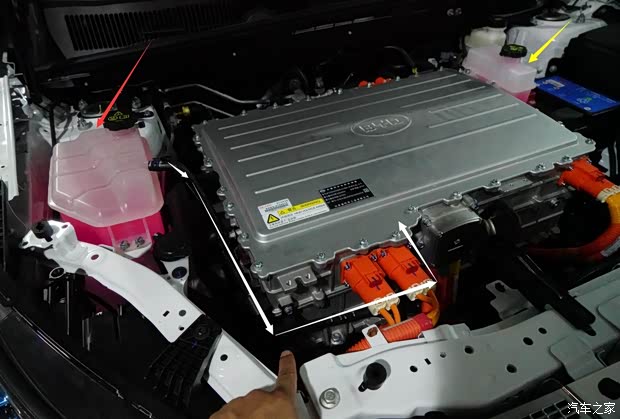 红色箭头:“4合1”电控总成散热管路储液壶 白色箭头:至“4合1”电控总成散热管路上行水管 黄色箭头:电动空调散热管路储液壶