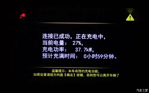 宋EV300只能在车辆“熄火”后,才能够进行充电。27%剩余电量开始充电,59分钟后即可充满,充电功率37.7千瓦。