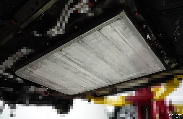 上图为宋EV300两驱版商品车中置的电池组件细节特写。原厂喷涂的防腐材料,等同于“底盘装甲”。实际上,深色的动力电池外壳(护板)为可拆卸。