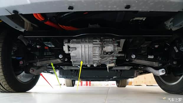 上图为混动版宋后驱动电机和悬架结构特写。