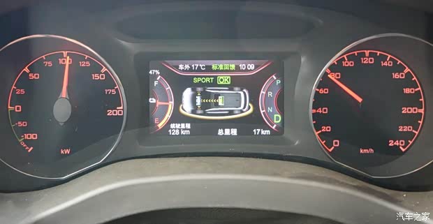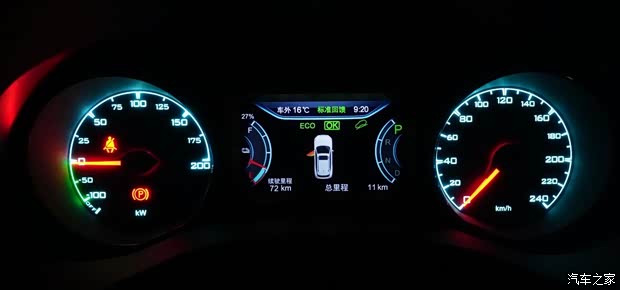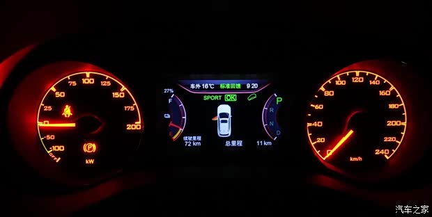 调节至SPORT模式,组合仪表呈现浅橘黄色色调。 这台行驶总里程仅有11公里的宋EV300两驱版,剩余电量27%左右,续航里程72公里。通过单纯的加减乘除计算,账面上折合的续航里程或不足300公里。考虑到整车出厂之后的非正常行驶状态,宋EV300前驱版的续航里程还要通过后续专业评测掌控真实表现。