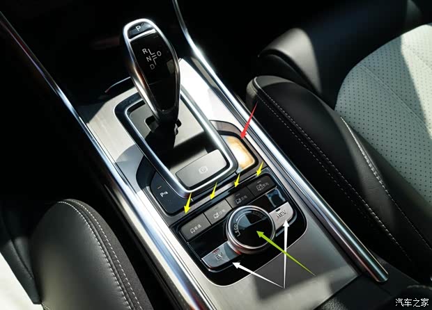 上图为混动版宋换挡杆换挡杆以及相关控制开关特写。 红色箭头:陡坡缓降功能开关(电子主车键右侧) 黄色箭头:配置在唐、混动版宋,与超级电4驱匹配的路宽反馈系统功能开关 白色箭头:EV模式和HEV模式切换开关 绿色箭头:ECO模式、SPORT模式旋钮开关