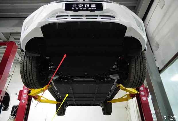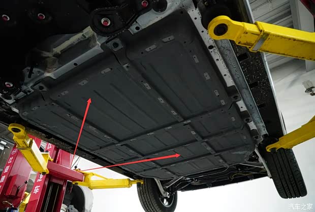 宋EV300两驱版商品车,前悬架被护板(红色箭头)全部“包裹”。47.5度电的动力电池组件中置。对于宋EV300商品车使用的是“磷酸铁”、“磷酸锰”还是“三元锂”电池,至今没有任何准确证据可以确定。 在此之前,笔者曾在相关稿件中指出,宋EV车系拥有搭载“磷酸铁锰”电池和“三元锂”电池不同版本,但是这一标定仅针对工程测试用车。考虑到47.5度电以及300公里续航里程,笔者认为宋EV300两驱版商品车动力电池为“三元锂”材质。 考虑到比亚迪e6续航400公里版,搭载的“磷酸铁”电池电量为82度电。宋EV300两驱版满载质量2.45吨,续航300公里,电池电量47.5度电,其使用“三元锂”电池可能性极大。