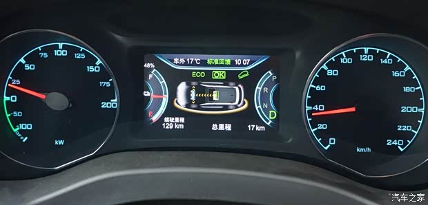 在ECO模式下,组合仪表呈现浅蓝色色调。 需要注意的式,笔者开启了陡坡缓降功能,并将能量回馈调节至标准状态。