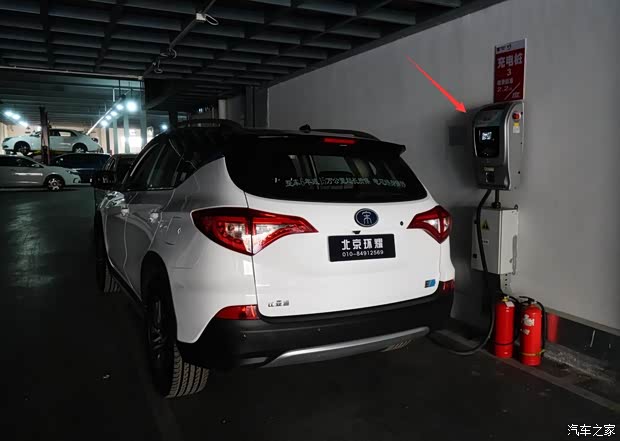 笔者使用比亚迪汽车北京环耀店内的40千瓦壁挂式充电桩(红色箭头),进行慢充测试(相对比亚迪匹配的3.3千瓦充电器还是快很多)。