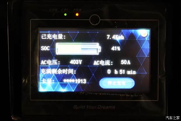 在比亚迪专用40千瓦壁挂式充电桩可显示,电池组件剩余电量(41%)、充电电压(403V)、以及充电电流(50A)。估算,宋EV300两驱版商品车使用40千瓦充电桩,充满电耗时约1.2小时。如果使用国家电网70千瓦充电桩,充满电时间或缩短至50分钟。 7、操控: