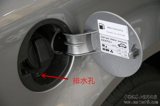 打开油箱加油口盖板,能够看到油箱盖内下方有排水孔,油箱盖密封并不严,里面又是往里凹,所以设置一个排水孔,能够让加油不小心散落的油及时排出,也能防止积水,冬天时很容易结冰,导致油箱盖无法打开。 |