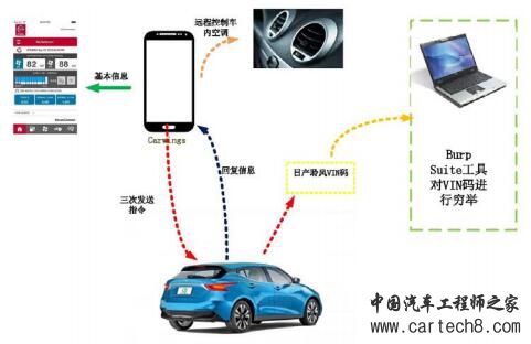 进口聆风电动汽车破解案例分析就在日产于MWC 2016(世界移动通讯大会)上发布聆风电动车最新手机APP后不久,澳大利亚网络安全研究专家Troy Hunt发现,软件开发者借助任何一辆日产聆风前挡风玻璃上的VIN码,便可通过Nissan Connect(日产车载系统)手机客户端的身份验证,获取车主身份及车辆充电量信息,并获得车内空调的操控权。虽然这一网络安全漏洞还未涉及油门、刹车等车辆控制关键功能模块,但对续驶里程本已相对有限的纯电动汽车来说,仅远程开启空调这一潜在威胁危害也十分巨大。下面我们来分析一下Hunt的攻击过程: Hunt的学生Jan通过聆风的手机App Carwings查看到车辆的基本信息,包括预测的剩余可行驶里程 、电池充电状态,充满电所需时间等。并且Jan发现充电与空调控制相关,空调界面,可以远程控制空调的开启,并设定时间。