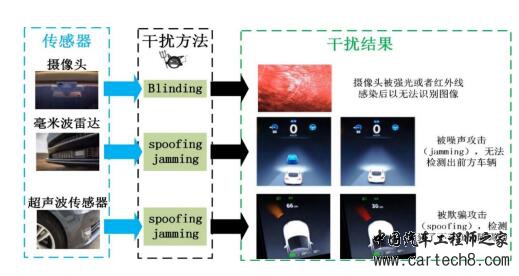 特斯拉Autopilot1.0自动驾驶系统配备超声波传感器12枚,摄像头一枚,毫米波雷达一枚。其中毫米波雷达安装在特斯拉的前部,用以探测远距离的障碍物,最远可以识别到150米的障碍物;超声波传感器遍布汽车周身,用以感知车身周围大概五米范围的障碍物,主要被用于停车辅助功能;高清摄像头被放置在汽车前面,是特斯拉自动驾驶传感器中唯一可识别可见光的设备,用来识别车道线和交通标志。研究人员的攻击思路为:通过对传感器的干扰和欺骗,使错误的数据进入系统则会使自动驾驶系统产生错误决策,从而实现对特斯拉自动驾驶功能的攻击。