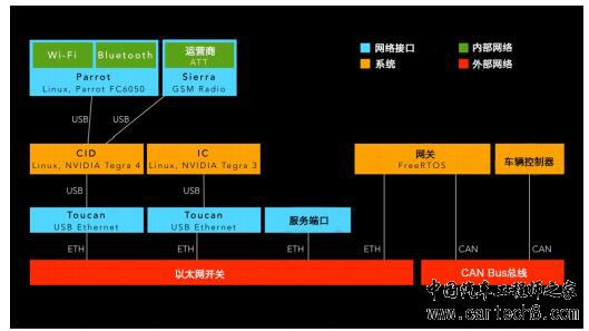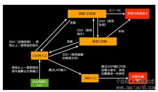 Kevin和搭档Marc首先对车子内部的物理硬件环境进行了勘察,并最终确定了一些可以入手的潜在物理漏洞。经过第一轮分析后,二位有了如下发现:CID上装有两枚可移除的存储卡、CID上有一个USB接口、一个作用未知的四针接口、很多功效不同的测试点和诊断界面。下面给出分析过程: 紧接着Kevin和Marc对汽车攻击面进行了探索,其中包括浏览器、蓝牙模块、USB接口、CID上的内存卡、WiFi通信模块以及上文提到的未知接口。其中浏览器方面,特斯拉Model S使用的依然是基于WebKit的浏览器,版本号534.34,属于很旧版本的车载浏览器,而且为了适应其他系统,其自身存在很多可能被攻破的漏洞。Kevin和Marc曾试图利用其中两个漏洞作为“安全”入侵Model S的武器,但不进行任意内存的读写。但如果不接入系统的调试器,只是盲目搜索,很难发现可被利用的漏洞。在两个可移除的内存卡中,发现其中一枚内存卡中有一个名为“carkeys.tar”的文件夹,包含了Model S的OpenVPN证书(x509认证级别),一枚RSA私人密钥和一枚OpenVPN静态密钥。另一枚内存卡中则是大容量的地图数据。WiFi通信模块这里并没有任何暴露的开放端口,每次系统在甄别是否存在活动的网络连接时,它都会尝试连接一个OpenVPN服务器。随后他们研究了发现的未知接口,这个接口其实是以太网接口,不过由于接口形式没有采取标准设计,因此不太容易辨认。Kelvin和Marc最后剥开一根标准Cat-5 UTP线,来确定引脚配置,以便能够和内部网络进行通信。 特斯拉Model S车载娱乐系统所有组件的信息沟通均透过车载局域网完成。但为了能和车内CAN总线实现信息互换,所有指令必须经由车载局域网和CAN总线之间的网关传递。