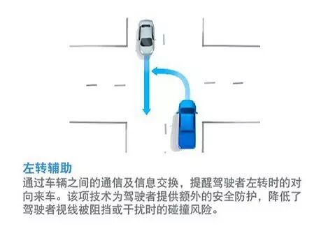 左转辅助技术:车辆在路口进行左转时,系统会提示有对向来车以减少碰撞事故的发生。 在现阶段对于左转和直行经常无法统一路权认识的我国,这个功能真的还挺“本土化”的。上述基于信号灯的车速引导(TLOSA)系统采用的是V2I技术,而左转辅助技术事关行进中的不同车辆的相对关系,自然采用的就是V2V技术。