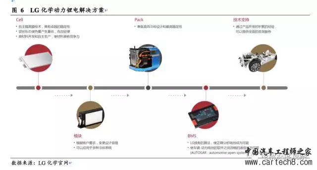 2.5 三星SDI:门阀子弟,以三星内部前沿技术高速发展 三星SDI1999年开发出行业内最大容量1800mAh圆形锂离子电池,2003年开发出2400mAh圆形锂离子电池,加之与三星电子的关系密切,迅速壮大,2010年小型二次电池业务世界市场占有率达到第一。2009年,三星SDI宣布新能源愿景,并于次年电气汽车用电池工厂竣工。2015年5月, 三星SDI100%收购在电池组项目领域具有世界最强竞争力的公司MSBS。三星SDI以三星集团为依靠,为三星电子供应电池,大量的资本与先进的技术,经过十年消费锂电的技术沉淀,顺理成章地在动力锂电行业中占据一席之地,成为与宝马、奔驰等国际豪华车厂配套的动力锂电企业。 2.6 LG化学:世家贵族,以化学起家根基扎实 LG化学在1999年成功研发出了韩国首批锂离子电池, 2001年在美国设立分公司CPI,陆续展开动力锂电的研发,在2008年通用给沃蓝达一代筛选PHEV电池的时候,CPI脱颖而出。尽管LG锂电起步比日本晚了近十年,然而LG化学是一家化学品公司,使得LG化学在开发锂电池的时候有产业链协同优势,加之多年的消费锂电生产经验和人才、技术的积累,在动力锂电行业中突飞猛进也是水到渠成,成为奥迪、奔驰、通用、福特、现代、菲亚特-克莱斯勒等世界一流车企的动力电池供应商。