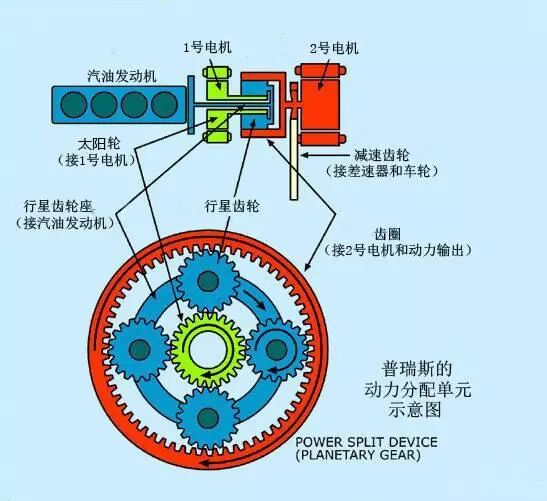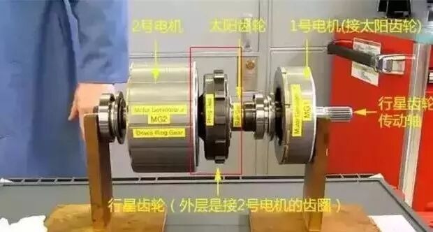 但E-CVT里面有行星齿轮机构,但没有传统AT变速箱常见的液力变距器等动力传递和换挡控制部件。确切地说,E-CVT并不是传统意义的变速箱,而是一个动力分配器,它用来协调电动机和发动机之间的工作关系,是专门为混动车型而准备的动力分配机构。但传统意义上的所有变速箱功能,E-CVT也一并承担起来了。 结构和工作原理 用传统变速器的眼光来看,E-CVT的结构非常简单,其中外齿圈连接2号大电机和输出,行星架连接发动机,太阳轮连接1号电机。