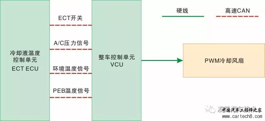如上图所示,驱动电动机冷却原理如下: 利用传导原理,将热量从PEB/驱动电动机组件传递到冷却液中,带有热量的冷却液流过散热器内的蒸发管路,通过冷却风扇吹动气流,将热量传递到大气中。当系统处于较低温度时,冷却液泵不工作。当温度上升后,冷却液泵工作,冷却液经过软管流入散热器内,散热器将热量散发到空气中,使PEB/驱动电动机组件保持在最佳的工作温度。 冷却液从右侧上部水室到左侧底部水室流经散热器,由经过芯体的空气进行冷却。冷却系统的温度是由ECT传感器来测量的。该传感器向PEB发送信号,根据需要控制冷却风扇的操作。冷却液温度信号由PEB经过CAN总线到显示冷却液温度到组合仪表。该组合仪表上会实时显示冷却液的温度,如果冷却液温度变得过高,则组合仪表上的警示灯和消息将提醒驾驶员。 (3)冷却风扇的控制 荣威E50冷却风扇的控制原理如下图所示。