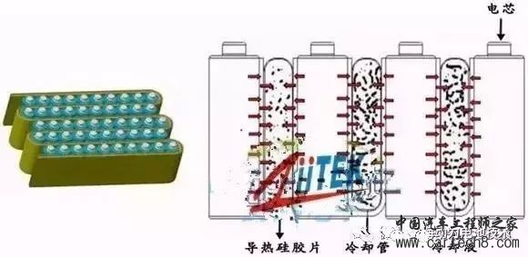 在动力电池的3个主要类型中,圆柱电芯虽然不是占有市场份额最大的,但由于其在消费品市场的广泛用途,使得它的商业化标准化却是最为成熟的。其工艺经过多年的沉淀,稳定且一致性最好。三元材料的圆柱电芯,能量密度能做到210~250Wh/kg。大规模标准化的电芯,使得模组也具备了自动化生产的前提。 圆柱电池体积小,非常适用于空间不规则的电池包箱体内,可以充分利用边角空间。虽然当前18650面临被21700替代的问题,但小规模形状复杂动力要求不高成本又比较敏感的车辆上,18650还是会在一段时间内保有自己的一方天地的。 模组基本结构 在圆柱电芯模组设计中,模组结构是多种多样的,主要根据客户和车型的需求来确定,最终导致模组的制造工艺也不一样。模组一般由电芯、上下支架、汇流排(有的也称连接片)、采样线束、绝缘板等主要部件组成,如下图所示。 结构设计 圆柱电池模组的结构设计,其目的是将多个圆柱电池固定在指定位置上,保证合理振动冲击条件下,不要发生过大位移。电芯位置由电芯支架确定,如果遇到极端情况,电芯支架可能会变形,为了保持电芯之间的距离,一般都会单独设计耐高温、质量小的电信间距保持件。下图中江淮iEV5模组中间的黑色部分应该就是这个类型的设计意图。 圆柱电池模组内部,并联比较容易实现,只要一块母排将电芯的一极接入即可,但要做到电流密度分布均匀,热场均匀,则是考验工程师水平的地方。一般都尽量设计成较为对称的结构,但模组进出线位置附近总归与其他电芯均匀布置的位置不太一样,因此是设计仿真的关键点。像特斯拉那样,做出奇异形状的并联母排设计,应该是经过热量和电流分布测算之后的结果(特斯拉模组在文章后半部分里找)。 动力电池模组散热方式介绍 当前被探讨比较多的就是液冷和相变材料冷却。圆柱电芯液冷模组的典型就是特斯拉,在后面的实例中将做介绍。单纯的液冷系统是将导热良好的器件紧贴电芯放置,尽可能均匀且高效的将电芯工作过程中产生的多余热量带走。 液冷可以像特斯拉那样完全独立运行,也可以与其他冷却方式相结合。其中的一个重要形式就是与导热硅胶结合,如下图所示。导热硅胶可以获得比金属接触金属更加紧密的贴合,进而获得更好的传热性能。