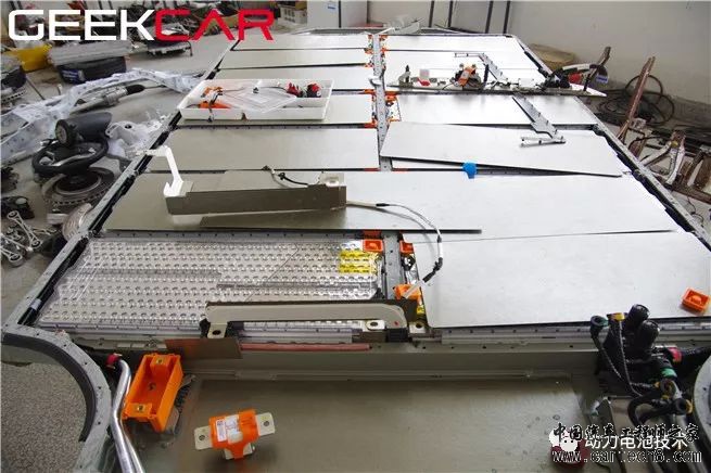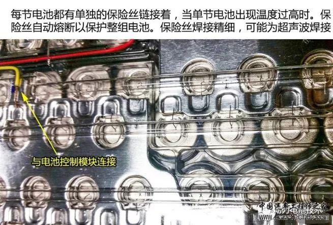 模组 力神2200mAh三元电芯,一个模组32颗电芯全部并联。没有找到显示电气连接和信号采集线的图片。 每颗电芯上的熔丝结构与特斯拉不同。