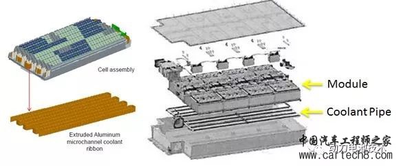 下面一幅图中显示的电池包爆炸图,其中棕黄色部分的显示了水冷管道的整体形状。据说,网上流传的被拆解了的特斯拉电池包,都是只有水冷管道,而冷却系统中并没有泵的存在。冷却液依靠热胀冷缩在小范围内流动。如果初始状态电芯一致性非常好,电池组内部的热量不均衡差异很小,只在小局部内相互均温就可以达到消除温差的作用。但如果需要启动加热功能,则这种局部流动就无法达成快速大量传热的目的了。