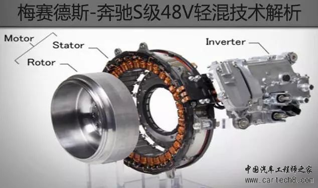 奔驰ISG一体式发电机,担负着整车启动、低速驱动、发电和动能回收的任务。 ◆48V轻混系统工作流程: 正如以上我们列举的48V电气系统综合组件的介绍,整套轻混系统除了根据一定的电脑逻辑进行运转外,也会进行智能的特殊情况处理。该操作视具体情况而定,需要视最新的驾驶情况、雷达传感器传输的信息及其他车辆数据而定,避免车辆在2s内骤停。因为车辆的骤停不仅无法实现省油的目的,还会提升车辆的油耗。