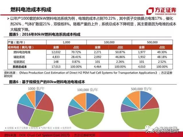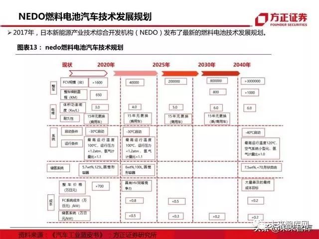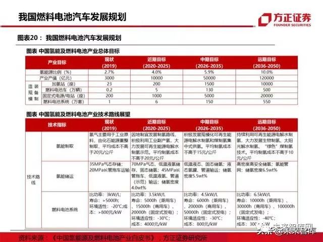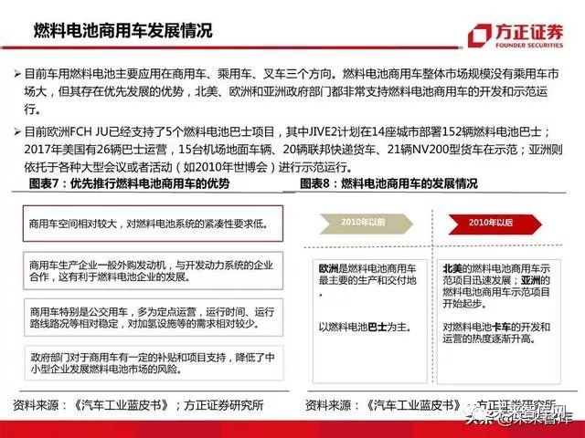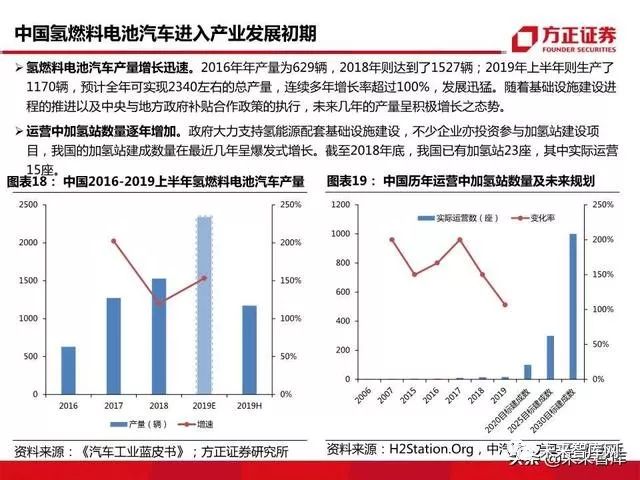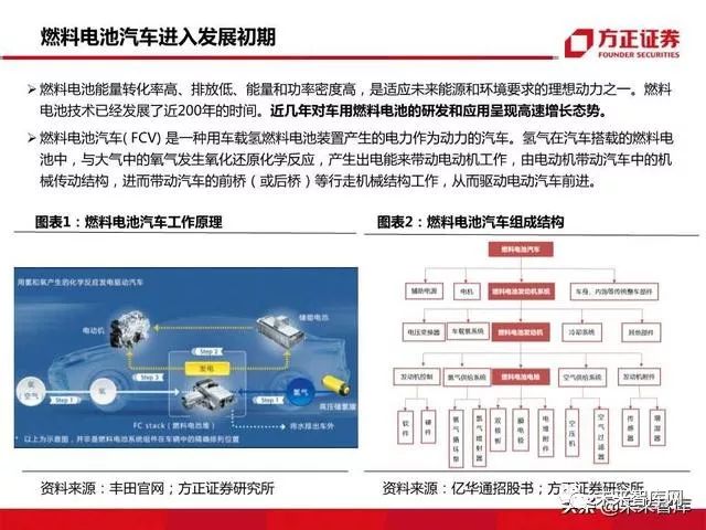 燃料电池汽车产业进入发展初期。由亍氢燃料电池具有清洁环保、发电效率高、车用体积小、重量轻、 能量密度高、续航里程长、加氢时间短等诸多优点