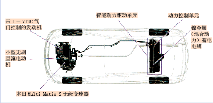 仪表盘的最左端表示的是电瓶的充电状况和电动机的功能 最节能的小型车典范 本田公司Civic小型车的发动机舱盖下面,安装的是一台横置4缸发动机,功率为70kW/95hp,输出扭矩为123N·m,配备的是CVT型无级变速器,此外,在这狭小的空间里,本田公司的工程师还安装了一台结构紧凑的电动机,与发动机的曲轴刚性地连接在一起,这一电动机的输出功率为15kW/20hp,最大输出扭矩为103N·m。 与丰田公司双功率输出(即由两个电动机和行星齿轮机构组成的驱动动力系统)的设计结构相比,本田公司的混合动力驱动方案更加强劲有力。 上述这些最初的功率数据并没有给人们留下什么太深刻的印象,但是其由“发动机+电动机”驱动式的1.8L排量的汽车,使得Civic成为最节能的小型车典范。 电动机驱动轿车 Civic所配备的电动机不仅仅在汽车启动时有辅助的作用力,而且在汽车加速时也能帮助加速,电动机自身有足够的能力单独驱动Civic轿车。当汽车的车速太低,或者发动机的负载太小时,例如在堵车、车辆走走停停的情况下,汽油发动机可以完全停止供油,而由电动机驱动。在下坡滑行、制动过程、均速行驶时或者发动机有剩余功率输出时,电动机将转换到发动机的状况下进行工作,将发出的电能保存到蓄电池中。 由于电动机和发动机之间没有离合器,所以发动机必须在电动机的拖动下启动。在这种情况下,发动机电子控制器关闭了汽油发动机的点火和喷油系统,本田公司专有的气门控制系统VTEC控制所有的气门关闭,以保证最少的摩擦损失。当需要汽油发动机重新工作时,4缸发动机即可迅速投入工作,不会出现任何干涉。