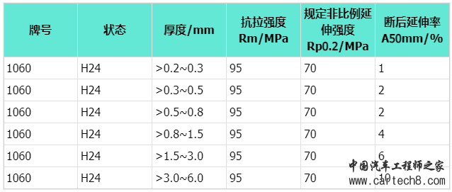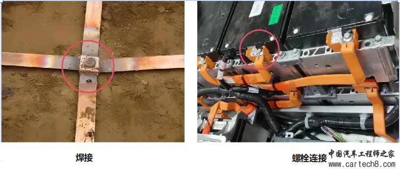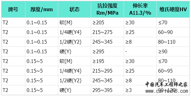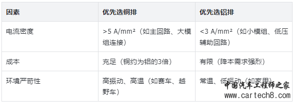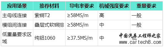 | “ 母排Busbar,也叫母线排、汇流排,负责在电芯、模组、电机、DC/DC转换器等之间传递电能,直接影响电动汽车的续航、快充能力,甚至是安全风险!” 目录: ![]() 母排Busbar,也叫母线排、汇流排,是一种用于汇集和分配电流的导电金属排,主要分为铜、铝两种材料,负责在电芯、模组、电机、DC/DC转换器之间传递电能,直接影响电动汽车的续航、快充能力,甚至是安全风险! 1,高压母排的材料基础特性在新能源汽车的电池包内,高压母排通常由铜或铝等具有优异导电性能的金属制成。铜排导电性高,能减少能量传输损耗,在对电流传输效率要求高的场合如高性能新能源汽车中是首选,但密度大、成本高;铝排密度约为铜的三分之一,成本低,能减轻电池包重量,在对电流传输要求不特别高、对重量和成本敏感的小型新能源汽车或城市通勤车辆电池包中广泛应用,不过其导电性略逊于铜排,电阻相对较大,会有能量损耗和发热问题。1.1 铜排铜排主要有T1/T2紫铜排,其纯度分别≥99.95%和≥99.90%,导电率高(T2约59.6MS/m),能降低电池包内阻、减少电能损耗,且机械强度适中(抗拉强度200-250MPa)、耐氧化性强,适用于动力电池主回路等高电流密度、高可靠性场景。![]() 1.2 铝排铝排多采用1系列铝(纯铝,如1060)和60系铝合金。铝排多采用纯度≥99.6%、密度2.7g/cm³、导电率约37.7MS/m、成本约为铜1/3但抗拉强度≤120MPa的1系列纯铝(如1060)和添加镁、硅元素后抗拉强度达260MPa、屈服强度240MPa且耐腐蚀性更好的60系铝合金(如6061-T6),其中60系铝排因强度高可避免模组集成盖板(CCS)极片焊接时因应力变形导致虚焊。![]() 1.3 绝缘材料为避免直接接触触电危险,电池包内用到的母排外表面一般需要包裹一层绝缘材料(高压箱内母排通常不包裹绝缘层,利于散热),绝缘材料主要类型和性能参数如下表所示。![]() 2,高压母排的设计要求1. 外观与尺寸母排的表面必须平整,边缘和表面不能有尖角、毛刺或裂纹,否则容易划破绝缘层或造成安全隐患。电镀层要均匀完好,不能起皮、破裂、鼓泡,端头焊接或压接部位要牢固,不能分层。绝缘护套统一为橙色,整体平整无明显划伤或形变,同一批次产品不能有显著色差。母排本体和护套的尺寸必须严格符合图纸要求,确保能在动力电池系统中顺利装配。2. 材料选型材料选择不能凭经验,必须遵循国家标准:铜排参照GB/T5231-2012《加工铜及铜合金牌号和化学成分》,推荐选用T2及以上牌号纯铜;表1:铜排化学成分质量分数(对应GB/T5231—2012T2铜)![]() 铝排参照GB/T3190-2008《变形铝及铝合金化学成分》,推荐选用1060牌号;表2:铝排化学成分质量分数(对应GB/T3190—20081060铝) ![]() 不同应用场景有明确推荐:主母线连接选紫铜T2(导电率≥58MS/m),模组间连接选叠层式软铜排,低重量要求区域选纯铝1060(导电率≥37.5MS/m)。 3. 力学性能母排要承受装配、行驶中的振动和应力,力学性能必须达标:铜排参照GB/T2059-2017和GB/T5231-2008标准,比如0.1-0.15mm厚的软态(M)T2铜排,抗拉强度≥205MPa,伸长率≥30%;硬态(Y)铜排抗拉强度≥295MPa;表3:铜排力学性能(对应GB/T2059—2017T2铜)![]() 铝排参照GB/T3880.2-2012标准,1060铝排H24状态下,抗拉强度≥95MPa,规定非比例延伸强度≥70MPa,断后延伸率随厚度增加而提升,最厚可达10%。表4:铝排力学性能(对应GB/T3880.2—20121060铝,H24状态) ![]() 材料选型推荐: ![]() 4. 截面与电流母排的有效截面积必须满足额定/峰值电流的载流需求,还要兼顾机械可靠性和工艺便利性。比如:额定电流100A时,铜排截面积≥20mm²,铝排≥25mm²;300A时,铜排≥60mm²,铝排≥78mm²;如果电流介于表中数值之间,就按大一档电流选型(比如120A按150A选型)。表5:电流与截面积对应关系![]() 5. 安装固定安装后的母排必须稳固可靠,不然行驶中振动容易出问题:硬连接排跨接长度超过180mm、柔性连接排超过150mm,都要设置固定点;常用的固定方式各有讲究:尼龙扎带(锁紧力150N,间距100mm)适合柔性连接排和线缆;自锁卡扣(锁紧力≥30N,间距120mm)适合硬连接排和结构件;螺栓连接(间距≤180mm)用于主干连接排和关键连接点,螺栓得用8.8级及以上高强度的。![]() 6. 电气绝缘电气绝缘是避免触电和短路的关键,要求十分严格:绝缘电阻:室温下施加500VDC或1.5倍标称电压(取较大值),最小瞬时绝缘电阻≥0.1KΩ/V,且计算值≥1kΩ/V;耐击穿电压:室温下在铝排本体与绝缘层间施加2500VAC(50~60Hz)电压1分钟,不能出现击穿或电弧现象;电气间隙与爬电距离:按电压等级划分,比如30-50V时两者均为1.6mm,661-1000V时均为19.1mm(经安全验证可酌情减小)。![]() 表6:电气间隙与爬电距离要求 ![]() 7. 表面处理母排表面处理主要为了防腐蚀、方便焊接,常见三种方式:电镀镍:适合铜排的端头和螺栓连接点,耐腐蚀性强、硬度高,但成本较高,导电率会略有降低;电镀锡:适合铜排的柔性端口和焊接区域,易焊接、成本低,但潮湿环境下容易变色,不宜接触手汗;镍片贴敷:铜排、铝排都能用,尤其适合柔性连接排层间,焊接时不易高温氧化,耐抛光清洗,但与基材导电性不一致。表面处理方式对比![]() 8. 其他关键要求温升控制:40℃环境下施加1C电流40分钟,母排表面温度不能超过80℃;禁用物质:铅、汞、六价铬、多溴联苯等物质限值≤0.1%,镉≤0.01%,石棉完全禁止;表7:产品禁限用物质限值要求![]() 阻燃性能:非金属防护层需满足UL94-V0等级;接触电阻:铜排端头接触电阻≤50mΩ,铝排端头≤100mΩ;螺栓固定需二次定
