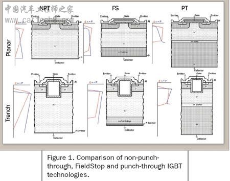 混合动力汽车(HEV)市场的增长在很大程度上取决于每加仑/英里这一能耗指标及追加投入的每个硬币所带来的好处以及混合系统现场的可靠性。消费者将混合汽车与标准汽车进行比较,并期待在整体更低拥有成本的前提下起码具有同样的性能和可靠性。混合汽车增加的成本必须在拥有期间通过节省燃料和维护成本得到回报。 用在HEV中逆变器和dc-dc转换器中的功率模块和其内的功率器件是主要的性能、可靠性和成本驱动器。效率、功率密度和特定功率是一些关键性能指标。最重要的可靠性规范是热循环和功率循环。 混合动力汽车的分类 在混合汽车驱动系统中,需将一或几个电机与燃烧引擎一起使用。可根据混合程度和系统架构对混合汽车进行分类。可被分为微(micro)级、轻度(mild)级和完全(full)级的混合程度决定电机执行的功能。该分类还决定所需的功率级及优选的系统架构。 串行、并行和功率分配是最常用的架构。对一款特定车辆来说,混合程度和系统架构的选择主要取决于所需的功能、车辆大小、行驶年限及设定的燃油经济性指标。每个混合系统的功率电子内容各不一样,它取决于功能、功率要求和架构。 当仅需要启动-停止功能时(例如旅行车场合),用一个集成起动器/交流发电机系统代替了起动器和交流发电机的并行微混合的方法就很通用。在这些系统中,电压和功率等级相对较低,其油耗的改进在10%左右。 除启动-停止功能外,当需要时,一个轻度混合系统可提升/辅助引擎功率,另外,它还从再生制动中获取能量,从而可将油耗的改进提升到15%左右。增加的功能需要更高的能耗,所以要采用高压器件(80V 到600V)。 若以完全电子模式运行车辆,则需要一个具有高压和大电流能力的完全混合系统。根据应用,完全混合系统可具有串行、并行和功率分配架构,它可将油耗降低35%。 HEV系统中功率电子面临的挑战 HEV系统中的功率电子需高效地将能量从dc转至ac(电池到电机)、从ac转至dc(发电机到电池)及从dc 到dc(对升压转换器来说,是从低的电池电压到高的逆变器输入电压;对降压转换器来说是从高压电池到低压电池)。因在该能量转换中,要对高压和大电流进行开关,所以需采用具有最低损耗的功率器件技术。对较低的系统电压和电流来说,MOSFET技术比IGBT有更好的功率密度,它们用在微混合应用中。对轻度混合应用来说,当系统电压高于120V时,IGBT是首选器件。对全混合应用来说,600V到1200V的IGBT是使用的唯一器件。 一般来说,传统的NPT IGBT在导通损耗和开关损耗特性间有一个平衡。若导通损耗降低则开关损耗增加。英飞凌的沟道FieldStop IGBT及配套的EmCon二极管技术与传统器件相比,在增加芯片电流密度的同时减小了导通和开关损耗。通过采用一个场截止(fieldstop)层来得到更低损耗,该层减小了器件厚度并降低了通过器件的压降。图1显示了平面和沟道器件所用不同IGBT技术的截面层。另外,Field-Stop器件可连续工作在150 °C(最高175 °C)的结温度,该特性强化了芯片电流密度并使采用更高的冷却温度变得更容易。