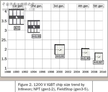 嵌放在一个便利封装内的功率模块可承受极端温度环境、震动及其它恶劣环境条件。除器件工作引起的温度变化外,环境温度变异及车内产生的振动带来可靠性挑战。在混合汽车应用中功率模块预期的使用寿命是15年/15万英里,所以在设计该模块时,要使其能具有期望的可靠性。例如,在某些情况,更高的器件性能会对模块的稳定性产生不良影响。从器件技术的角度讲,某些功率器件可工作于高的结温度,但该更高的结温度会在线绑定接口产生更高温度,从而降低模块功率周期的稳定性。因此,需建立一整套全面的器件和封装技术规范来优化性能、可靠性和成本。 混合车用功率半导体模块 应用需要功率模块具有高电流密度,这也就意味着每单位电流容量具有更小的体积。器件越小,包纳其于其内的底层也就越小,结果就得到一个模块虽小但功率密度更高的模块。图2显示的是英飞凌预期的1200V器件体积的减小情况。显然,与NPT器件相比,FieldStop器件显著缩小了体积。