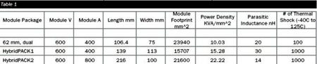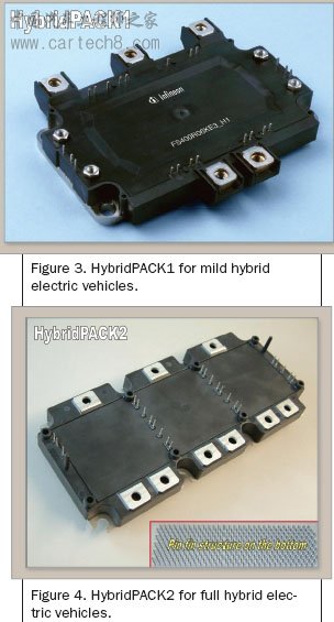 封装设计和互连技术对模块的寄生感应产生很大影响,它们也可被用来改进功率密度。另外,选择的材料也会对性能和可靠性产生影响。例如,氮化硅底层的成本比氧化铝底层的成本高很多,但前者的热性能明显好于后者。同样,昂贵的铝硅碳化物基板也比便宜的铜基板具有高得多的热循环可靠性。 当为HEV设计功率模块时,需在设计开始就明确关键的障碍。需采用恰当的器件技术、底层布局和封装技术以满足性能、可靠性和成本目标。表1显示了三种模块在性能和可靠性方面的对比,它们分别是:用于工业可变速驱动的标准半桥62mm模块、用于轻度混合的六单元(six-pack)HybridPACK1模块(图3)和用于全混合的六单元(six-pack)HybridPACK2模块。