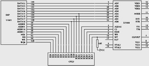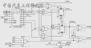 图4 CPLD的逻辑图 图4中,用74138进行译码,生成ALE、CS等信号。当执行指令6时,设置了外部空间的大小,在访问地址0x400000~0x4fffff时会使能MS0,74138的G2AN将有效。当地址A11~A8=0001,Y1N=0,CANCS的清零由DSP的RD控制,RD信号的低电平将使CANCS=0,指令11完成此功能。当地址A11~A8=0010,数据D19~D16=1000,则Y2N=0,DSP的WR信号的将使CANCS=1,指令14完成此功能;当地址A11~A8=0101,数据D19~D16=0111,则Y5N=0,DSP的WR信号沿将使ALEhigh=1,此时CANWE始终保持1,CANALE为WR取反,指令8完成此功能;当地址A11~A8=0110,则Y6N=0,RD信号的低电平将使ALEhigh=0,此时CANALE始终保持0,CANWE为WR,指令10完成此功能。 ADSP21062仅有3个外部中断,在挂多个外设时就显得资源紧张。图4中,低电平有效或下降沿有效的中断信号可以用与的关系连接到一个中断上,DSP在响应中断后,读相应的多个外设,判断是来自哪一个外设,这样就可以扩展更多的中断。 结语 SJA1000接口为地址/数据复用模式,DSP处理器通常为地址/数据总线分离的结构,本文提供了两种不同接口的思路和方法。测试表明,这种方法确实可行,传输效率高。 |