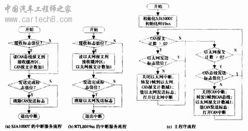 图6 通信模块软件流程图 在调试过程中发现,如果转发过程被特定的中断程序打断,可能发生报文计数错误;如果向RTL80 19AS写入待发送报文的过程被以太网接收中断打断,就无法恢复写入过程了。因此在转发过程中应屏蔽相应的中断。 4 结束语 采用上述方法实现的CAN-Ethernet 通信模块,解决了以太网和现场总线CAN 总线之间互联问题,可以根据应用的需求,进行灵活的配置和改进,提高系统的性能和可靠性。实际证明,在局域网环境下模块工作可靠,在以太网负载适中时,只有很小的通信延迟。它为CAN-Ethernet 的互联提供了低成本、高性能及灵活的解决方案。 |