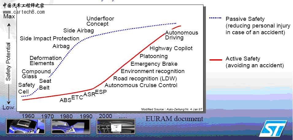 图一 汽车安全系统从被动向主动方式发展的趋势图 1. 预碰撞系统 汽车交通事故大都由于相对高速运动状态物体间的碰撞,而引起碰撞的原因大多与违反交通规则、驾驶人视线受阻和精力不集中有关,如酒后驾车、疲劳驾驶、驾驶期间接打电话和聊天等。目前许多厂家都在研究预碰撞(Pre-Crash)安全系统作为应对。 预碰撞安全系统可分为对车内人员(驾驶员和乘客)的保护和车外人员(车外行人和车辆)的保护两类,但安全保障的核心都是对碰撞动作的积极准备和防护措施。对于车内预碰撞安全系统,当相关传感器或雷达探测到潜在的碰撞危险,会首先向车内驾驶员发出警告,如警告无效则在0.6秒前启动自动剎车系统,根据驾驶员的刹车力量增加辅助油压以充分降低车速,避免碰撞。同时,预碰撞安全系统也会在车内为被动防护提供支持,如关闭车窗、调整座椅角度或安全带松紧程度以减轻碰撞强度和让安全气囊发挥更大作用等。在车外,预碰撞安全系统也可通过一系列措施尽量保护被撞对象的安全。如碰撞不可避免,安全系统会打开与行人受撞击面相对的外部安全气囊(如保险杠、风挡玻璃等处),尽量减少对其头、胸、腰等脆弱和致命部位的撞击力。 2. ACC自适应巡航控制系统 所谓预碰撞系统,只能在碰撞发生之前做出的一系列积极准备,而并不是“预防”碰撞的发生。目前发展迅速的ACC(Adaptive Cruise Control),即自适应巡航控制,则能部分实现碰撞事故的预防。 ACC属于前向行驶的速度控制系统,主要功能在于控制本车与周边车辆的安全距离。其通过在车身四周配置的多个传感器和车内控制系统的先进算法向驾驶员提供安全驾车的辅助信息和建议,并在探测到潜在危险时向驾驶员及时发送警报,甚至直接介入车辆的操控系统加以干预。然而无论如何,ACC仅对刹车拥有部分干预程度,驾驶员仍然是驾驶的核心。 ACC实现速度和车距控制的关键在于锁定前方目标车辆,然后计算出该车的速度、加速度等行驶信息。车主会提前为ACC设定反应时间,ACC在行驶时则会再依据辆车的相对速度和当前车距计算出安全车距,并判断下一步的速度控制;而当辆车距离过近而超出ACC的控制范围,则系统切换至预碰撞安全处理系统。 3. 驾驶警示系统 驾驶警示系统主要通过CCD/CMOS等传感器和影像设备作为监视手段,通过内置辨识系统判断车辆状态和驾驶员的行为是否正常,如出现问题则及时发出警示信号避免事故的发生。也有的驾驶警示系统能探测出驾驶员呼出气体的酒精浓度并给予适当的警告。此外后方和侧面的监视器也可属于驾驶警示系统,其可消除驾驶员的视觉死角,避免倒车时常见的碰撞事故。 驾驶警示系统的功能主要包括车道偏离警示(Lane Departure Warning, LDW)、驾驶危险警示、视觉死角警示(或称盲点检测)等。其中车道偏离警示主要在驾驶员驶入错误的车道进行警告,或在变换车道时提示其打方向灯等动作。 驾驶警示系统能为驾驶员的安全驾驶提供有效的辅助信息,但如果辅助信息不够全面则无法起到其应有的作用。另一方面,一切事物都有其两面性,如果辅助信息过多或过于复杂,不但对安全驾驶无益,有时反而会让驾驶员疲于处理各种辅助信息而精力不集中,容易酿成事故。 此外,辅助信息通过何种手段发送给驾驶员也是值得研究的问题之一。屏显、仪表板、语音等属于传统的手段,目前还出现了“体感警示”的方式,即汽车通过振动踏板、座椅、方向盘等来向驾驶员发送信息,或引起其注意。 |