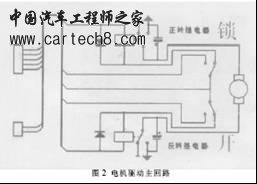 三、系统的硬件组成 (一)电机驱动主电路 系统通过控制电机的正反转来实现对车轮锁定和开锁功能,实现电路如图2所示。主回路根据控制器的指令,LOCK、OPEN分别控制继电器K1、K2的闭合,实现电机的正转、反转, 进而控制车轮刹车油路,从而达到四轮抱死或者松开的目的,实现了防盗功能。为了防止电机过旋转,设置了限位开关STB1、STB2,实时地将信号反馈给控制器,使系统能够稳定地工作。