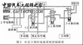 操纵杆置于D位置、3挡行驶时,电液系统控制原理如图2所示,液压执行元件C0、C1、C2、C3接合。