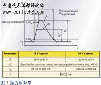 车载电源管理的要求正变得愈加苛刻,其要求电源能够工作在更宽泛的输入电压范围、更高的电流及更高的温度极值条件下。这些要求将使开关模式电源设计成为主流,因为这种电源设计具有更大的灵活性、更优异的可配置性和更高的散热效率。 开关模式的电源的核心组件是 DC-DC 转换器。今天的车载转换器必须能够支持各种运行条件,例如:低压运行(也就是冷启动)和正瞬态生存性 (positive transient survivability)(也就是抑制或未抑制的抛负载状态)。车载子系统的出现所带来的更高负载需求使得这些数据的设计变得更为复杂。本文将给设计者提供一个关于车载电源需求的简要介绍,并且介绍一款由 TI 最近推出的新型 DC-DC 转换器 TPIC74100。 瞬态保护 抛负载 几乎所有直接连接至汽车电池的电子组件和电路都要求保护,以免于受到抑制、瞬态电压(高达60V)和反向电压状态的损害。对于这些电子电路而言,必须能够经受住电源线路上一定程度的过电压,这也是种常见的要求。对于那些要求任何特殊车载电子系统的主电源输入均能够在各种不同瞬态电压状态(包括交流发电机抛负载)下工作的车载系统来说尤为如此。 由于交流发电机控制环路关闭的速度不够快,因此,在将电池电压去除掉时,其会产生一个高输出电压脉冲。正常情况下,在汽车某个中央位置,这种高能脉冲被控制(或抑制)在一个较低的电压范围内。但是,汽车制造商还是给其供应商规定了在其电源输入端可能出现的剩余过电压。这种情况在不同轿车厂商中有所差异,但是轿车的标准峰值大约为 40V,而商务车的标准峰值则大约为 60V。一个典型抛负载脉冲的持续时间为十分之几秒,下图(图 1)显示了该抛负载状态下的典型脉冲。