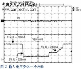 仪表板应用中的冷启动 车载环境对于电源管理芯片的需求正日益增加。这些需求之一便是需要电源管理 IC 能够在一个宽电压偏移范围内工作,直接连接至电池的电子系统通常都会有这种电压偏移范围。通过观察该冷启动脉冲,可以描述出此类瞬态的一个实例。这种状态可发生在寒冷环境下车辆的第一次启动。如果温度足够低(冷却至零摄氏度),那么引擎的油就会变得粘稠,通过要求提供更高的功率(扭矩),这就对马达提出了重负载要求。这样就需要能够提供更高电流的电池。重负载需求可以在该点火周期内将电池电压立刻下拉至 3V。