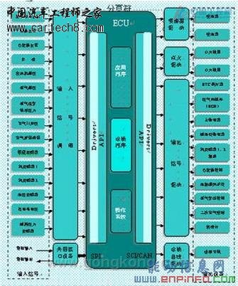 一、 汽车发动机电子控制系统概述 汽车发动机电子控制系统(Engine Electronic Control System, 简称EECS)通过电子控制手段对发动机点火、喷油、空气与燃油的比率、排放废气等进行优化控制,使发动机工作在最佳工况,达到提高性能、安全、节能、降低废气排放的目的。汽车发动机电子控制系统主要包括: - 燃油喷射控制; - 点火系统控制; - 怠速控制; - 尾气排放控制; - 进气控制; - 增压控制; - 失效保护; - 后备系统; - 诊断系统等功能。 另外,随着网络、集成控制技术的广泛应用,作为汽车控制主要单元的EMS系统通过 CAN(Controllers Area Network)总线与其他控制系统,例如:安全系统(如ABS、牵引力电子稳定装置ESP (Electronic Stability Program))、底盘系统(如主动悬挂ABC(Active Body Control))、巡航控制系统(Speed Control System或Cruse Control System)以及空调、防盗、音响等系统实现网络互联,实现信息共享并实施集成优化统一控制。在不久的将来,车载通讯平台将利用现有无线通讯网络为汽车驾驶提供更广泛的咨询、娱乐等增值服务(如GPS全球定位系统的应用)。 汽车发动机电子控制系统的开发主要涉及以下技术内容: - 传感器 主要包括空气流量传感器、空气温度传感器、节气门位置传感器、冷却液温度传感器、转速传感器、曲轴位置传感器、凸轮轴位置传感器、爆燃传感器、车速传感器、氧传感器等。 - 执行器 主要包括喷油器、点火控制模块、怠速空气控制阀以及各种电磁阀等。 - 电控单元ECU(Electronic Control Unit) 和控制算法程序软件 其作用是通过采集各种传感器输入信号并将信号进行调理,根据发动机管理控制算法进行运算,然后输出控制信号并进行功率放大给执行器。同时检测传感器信号正常状态,出现故障时报警。 图1描述了汽车发动机电子控制系统示意图。