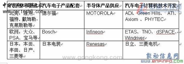 图1 另外,为了应对汽车产业产品作为多种产品链状集成开发的特点以及快速更新的市场需求,高性能的发动机试验台架、集成开发环境工具以及测试产品耐环境性能的设备为快速开发高质量面向不同汽车发动机的管理系统产品提供保障: - 发动机试验台架 主要包括不同种类的发动机以及工况装置、测功仪、废气测量仪以及各种传感器和测量装置。 - 集成开发环境IDE(Integrated Development Environment)系统 主要包括用于开发电控单元ECU 和控制算法程序软件的集成开发环境。目前,基于模型设计(Model Based Design)、快速原型(Rapid Prototyping)技术以及符合OSEK标准的实时操作系统得到了越来越广泛的应用。 - 耐环境实验设备 用于元器件、产品的耐温、振动、抗干扰、防漏水、耐久性等环境试验设备。 上述设施的联合使用,为开发汽车发动机电子控制系统提供必要的联调、参数标定、性能试验、环境试验等必要条件。另外,为了适应不同区域的气候条件,在不同海拔地区、不同季节的车载试验需要脱离发动机试验台架并借助车载标定系统在特定环境及试验地完成,以确定相对不同区域和气候的控制参数。 二、 汽车发动机电子控制系统应用市场现状 汽车发动机电子控制系统技术属于汽车电子领域的关键技术并占据汽车电子市场的主要份额。随着环保政策、能源政策限制力度的加大,大力应用电子控制技术,开发汽车发动机电子控制系统产品是未来汽车领域的必然。 国际上,汽车发动机电子控制系统的发展规模与模式日趋成熟。在国际知名品牌汽车的背后是专业化分工的汽车配件厂商,为其提供全套的汽车配件产品。其主要特点概括为以下几个方面: - 行业垄断; - 专业化分工、集成配套、产业链状开发与生产; - 电子控制技术与经验实用性相结合; - 集成开发环境技术确保产品的快速开发、测试、调试、标定。 下图与表格概述了这些特点: