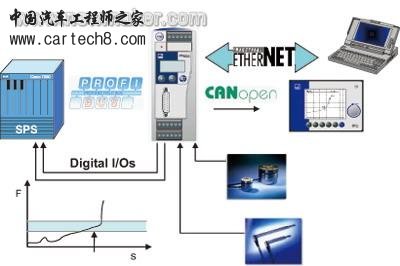 在现代生产过程中,安全保证、品质保证和效率保证正占据着日益重要的地位,这也是测量技术整合到制造过程中的重要原因。这种趋势不仅包括采用高精度、高稳定性、高可靠性和高动态的传感器,而且包括采用工业接口进行信号调理的模块系统。 输送装配线上的检测 汽车及零部件装配生产线是由输送设备(空中悬挂输送设备和地面输送设备)、专用设备(如举升、翻转、加注设备、助力机械手、检测及螺栓螺母的紧固设备等)及检测设备构成的有机整体。在这些生产装配领域,我们既要监控生产元件及生产过程的质量,又要提高效率并保证安全。 在汽车工业,安全可靠异常重要,尤其是在生产速度快速变化时。为了保证安全性,要求必须将错误操作、偏离生产正常流程的装配工序或缺陷产品自动报告给操作者或PLC等,缺陷报告作为警告信号用来保护生产过程和设备。对于装配应用来说,力(或压力)与位移(或时间)的匹配、扭矩与转角(或位移、时间)的匹配显得尤为重要。 为了达到零缺陷装配并生产出高质量产品,在许多产品生产测试领域,两个测量信号彼此间的功能关系必须被论证。如元器件的螺栓连接必须考察拧紧力矩与扭转角或位移的关系,以保证既连接牢靠又不会因为扭力太大而损坏元器件。通过压配来连接两个部件也是很普通的应用,为了监控元件生产的质量,同步测量力(或压力)和位移是压配过程的必然要求。 完美的监控方案 保证100%测试质量是极为重要的,但是这样严格的要求有时是和生产效率相抵触的。通常提高产品的生产效率可以通过减少停工期来完成,这就是为何采用载波频率放大器和6线制传感器来提高可靠性和精度的原因。除此之外,我们还可以进行完整测试并评估生产过程来缩短生产周期,通过采用此项技术可以进行实时分析,并优化生产过程来缩短生产时间。 HBM双通道PME-MP85A模块为此类任务提供完美的解决方案。MP85A最常用的就是压配场合生产过程监控。如变速器的轴承装配、气缸盖装配、换档杆装配、转向系装配及检测和车身连接等。另外,此解决方案还可应用在各种测试场合,如悬吊系统的弹簧和阀门测试、采用压力传感器进行柴油机喷嘴测试及汽车的温度和音响的开关测试等。即使这些测量任务各不相同,但步骤却有共同点:每个测试步骤都评估曲线形式和位置,并精确定义容差限制。更进一步是获取存储统计数据: 例如:最大/最小值、平均值和目标/实际偏差等。 图1为典型的MSA公司“开关象”压配测量监控系统。MSA公司为保证压装球轴承时压装连接百分之百的质量,使用力-位移监测系统进行在线监测。在操作过程中可以评价力-位移特性曲线。此处共使用了带MP85ADP测量放大器的4个联合监测系统监控4个工序工作站。