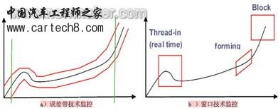 图1 “开关象”压配测量监控系统本应用选择了结构精巧量程为0~10kN的HBM U9B力传感器记录液压缸压装力和WA-10mm位移传感器记录机械臂位移,波形用误差带技术或窗口技术进行监测(见图2)。图2-a是用误差带技术监控生产过程,当生产过程任一点偏离X轴、Y轴误差带设定时,过程将会被评估为Not OK。图2-b是用窗口技术评估生产过程,可以通过多个窗口监控曲线进出窗口顺序以及曲线在X轴Y轴最大/最小值、平均值及限位值等。MP85A可将过程评估结果、限位溢出及储存器容量不足等信号进行数字输出(24V电平),我们也可以通过数字输入(24V电平)控制MP85A的清零、开始/停止测量等操作。不仅如此,通过软件,可以清楚地看到评估结果、限位报警以及输入输出信号状态。
