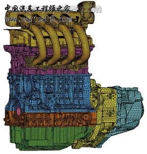 发动机是影响汽车NVH性能的最主要的因素,在发动机的设计阶段就深入进行振动噪声性能的预测与优化,已经成为发动机开发的基本流程,是发动机自主研发过程中的重要工作。 国内外对发动机结构噪声的预测做了大量研究,中低频结构噪声预测方法已趋成熟。结构振动响应与辐射噪声之间的关系非常复杂,目前根据强迫振动响应计算辐射噪声的计算方法主要有平板理想化法、有限元法和边界元法等。噪声预测技术的发展使得发动机在设计阶段进行噪声评价成为可能。 本文探讨了适于进行动力总成振动及结构噪声预测的方法;建立了动力总成各主要部件的有限元模型,通过AVL EXCITE软件进行了动力学分析,并计算发动机的振动响应。进行NVH的性能提升的最重要的就是首先要找到主要振动及噪声源,并开展有针对性的工作。为了更明确发动机的主要声源,采用自编软件,根据表面振动速度结果进行了主要表面的辐射声功率排序,最后进行结构噪声预测。 发动机结构振动预测 进行发动机结构振动及噪声预测,涉及到大量的研究工作,主要工作包括各部件有限元建模、子结构模态提取,EXCITE模型搭建,主要激励计算,动力学分析,振动响应计算,表面辐射声源排序,声边界元建模和空间声场预测等工作。 1. 动力总成有限元模型 动力总成有限元模型包括缸体、框架、缸盖、油底壳、缸套、进气歧管、排气歧管、气门室罩盖、4个悬置支架、变速器壳体、变速器传动轴及齿轮等。由于研究的动力总成的4个悬置支架中有3个是安装在变速器上,所以加入变速器壳体的有限元模型,这样可以更准确地模拟动力总成的振动情况,特别是怠速工况下的振动。图1所示为动力总成的有限元网格。同样需建立曲轴组件的有限元网格,曲轴组件包括曲轴、飞轮、扭转减振器、皮带轮和正时齿轮等部件。
